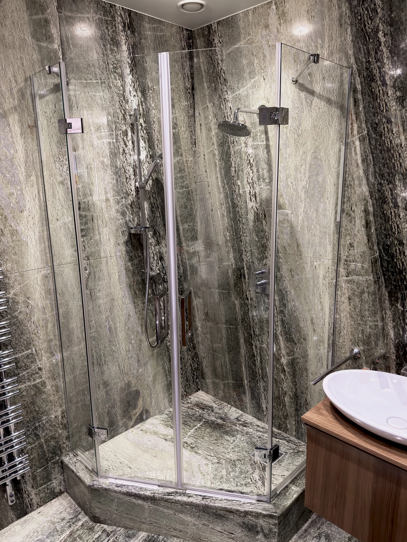 Закаленное стекло толщиной от 4 до 19 мм, окрашенное непрозрачной керамической эмалью любого цвета. Возможно изготовление по индивидуальному оттенку из палитры RAL.