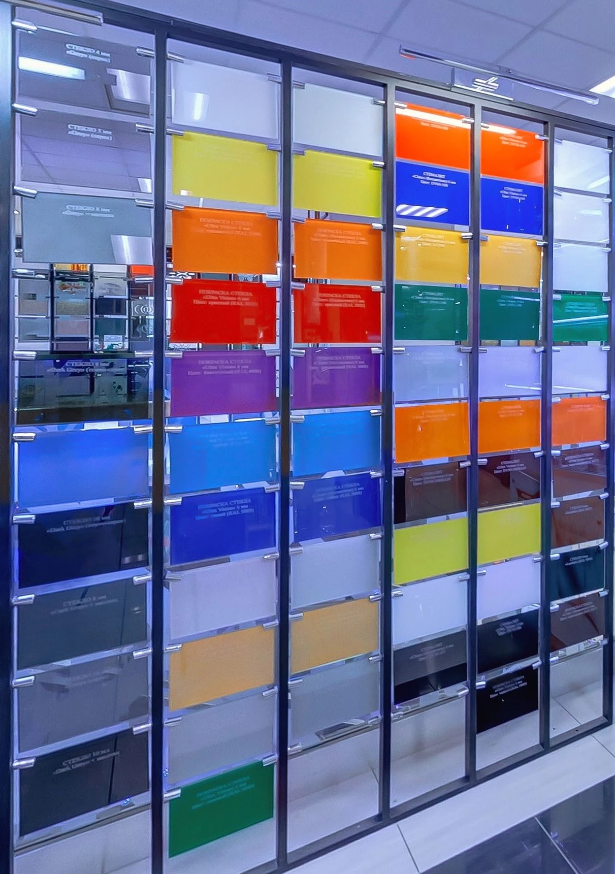 Цветное непрозрачное стекло толщиной 4 мм, окрашенное специальным слоем краски с лаковым покрытием. На выбор 6 цветов по RAL.