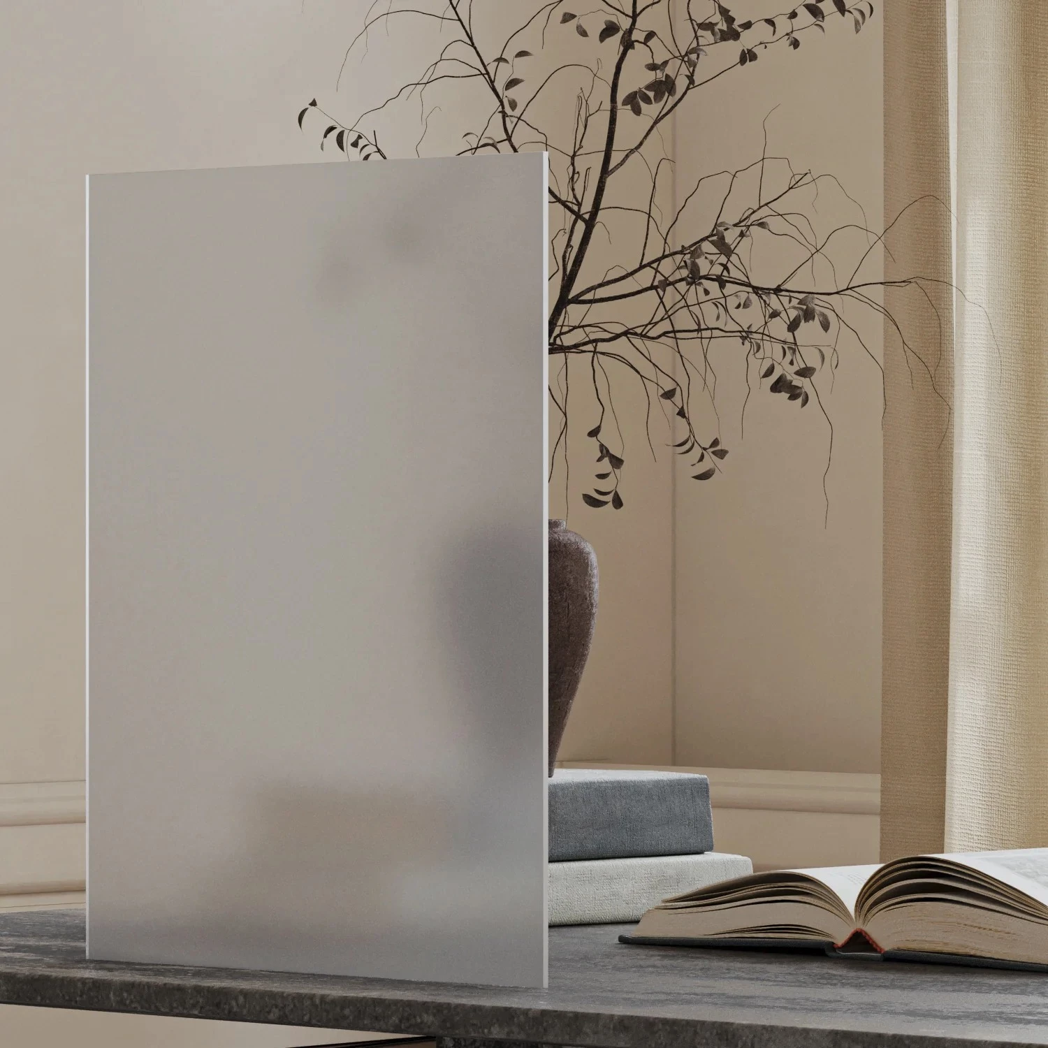 Прозрачность и приватность. Матовое стекло пропускает свет, но препятствует четкому просмотру через поверхность, что обеспечивает приватность.