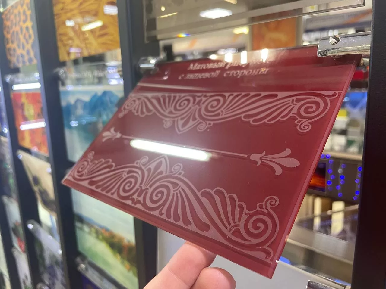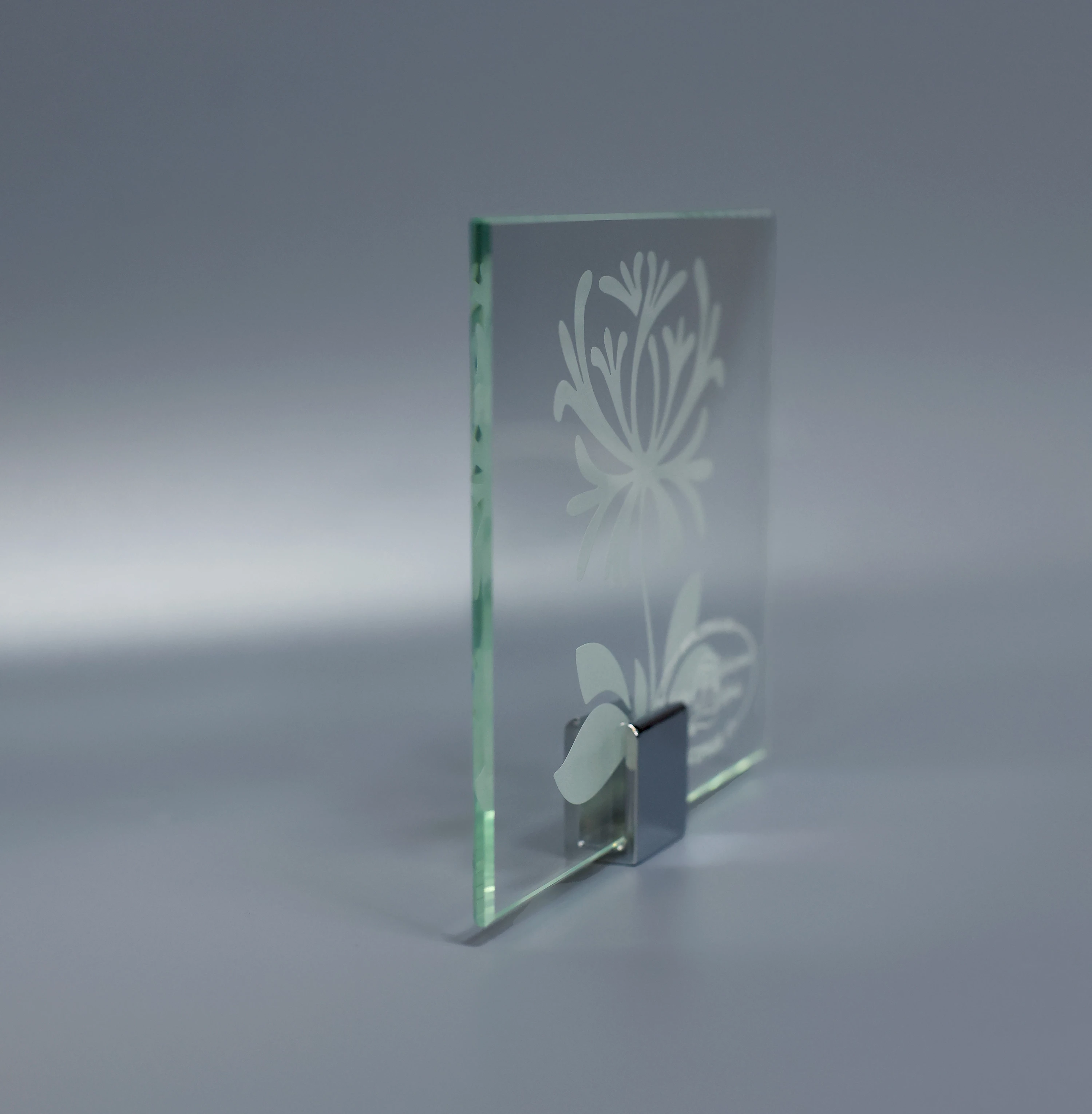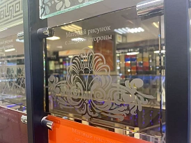 Каталог разработанных рисунков действительно впечатляет, и включает абстрактные узоры, рамки, цветочные мотивы, уголки, греческий орнамент. Процедура матирования осуществляется в специальном пескоструйном аппарате.