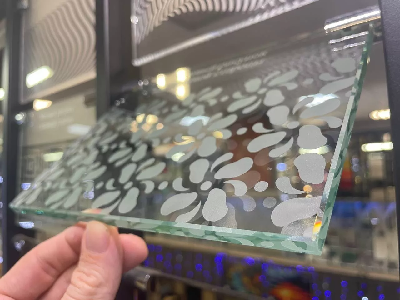 Технология пескоструйной обработки создает изысканную матовую поверхность с полупрозрачной зернистой фактурой. Шероховатые участки эффектно сочетаются с глянцевыми, образуя сложные световые эффекты при сохранении 90% светопропускания.