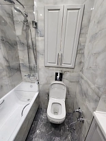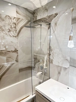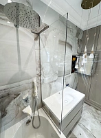 Душевая шторка из стекла прекрасно вписалась в общий стиль ванной комнаты, и вся ванная смотрится роскошно и современно.