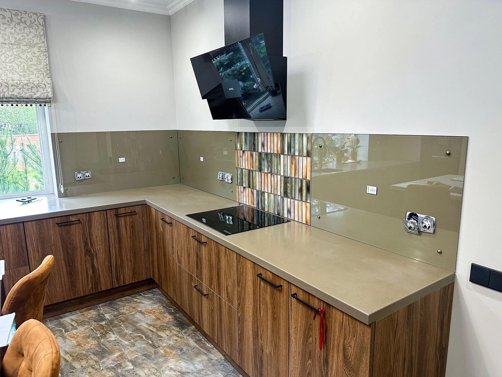Стеклянные скинали — красивый и практичный вариант оформления рабочего пространства кухни. Они бывают зеркальными, тонированными, крашенными и с фотопечатью. Ключевые преимущества стеклянных панелей скинали: влагостойкость, термостойкость и легкость в уходе. Фартук не только защищает стены, но и связывает кухонный гарнитур с общим интерьером.