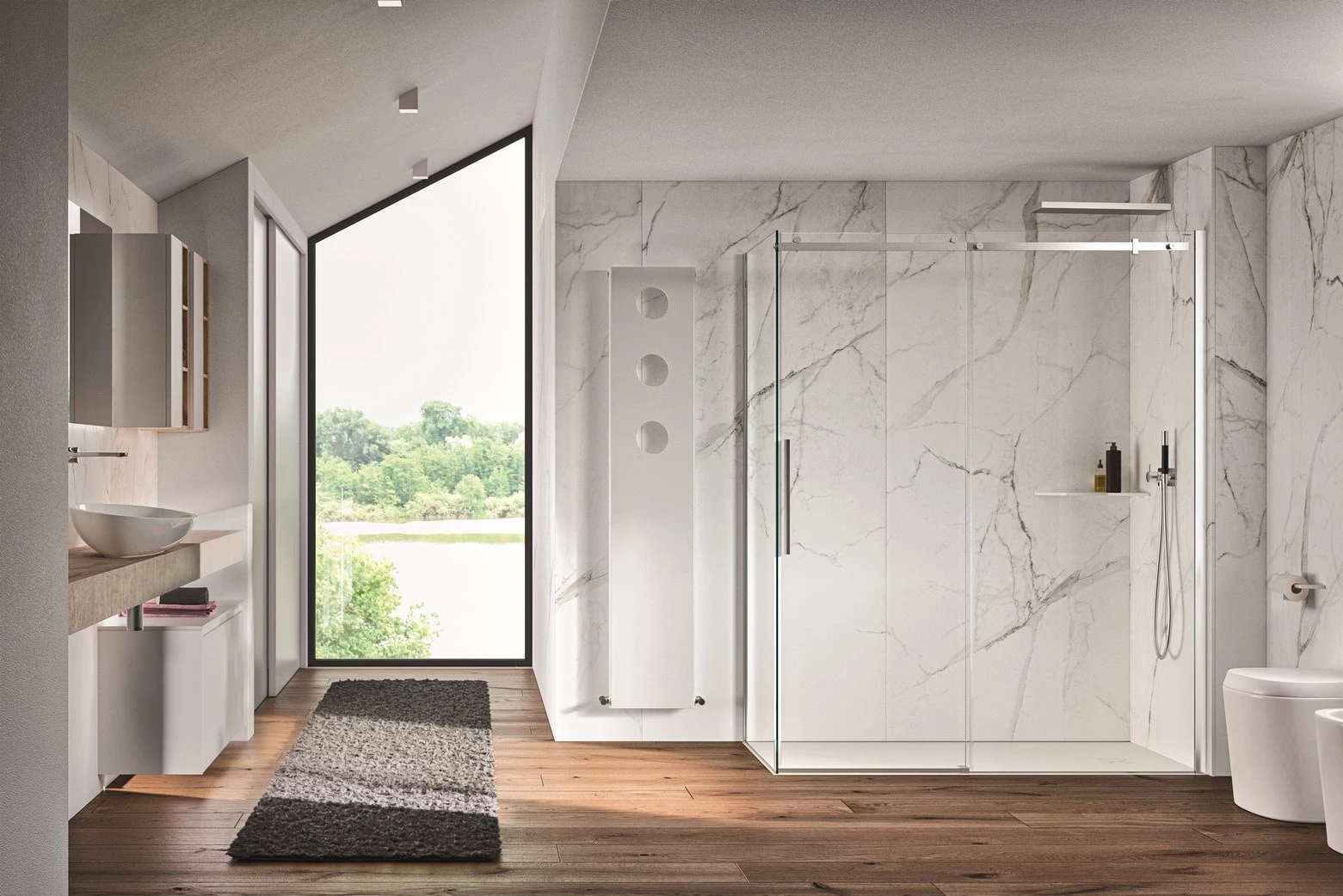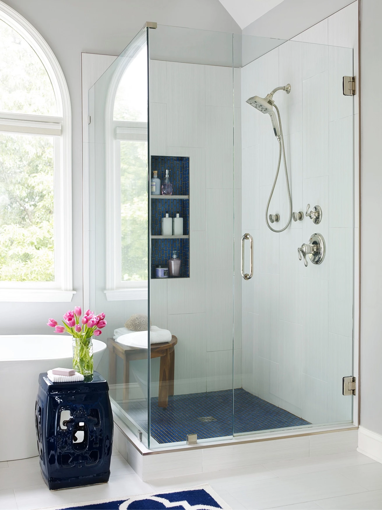 Угловые душевые ограждение-это идеальное решение для небольшой ванной комнаты. Их установка требует меньше материалов и трудозатрат, монтаж может осуществляться после окончания ремонта. Угловые душевые перегородки – это скрепленные между собой боковая створка и дверь из закаленного стекла. Конструкция крепится к стене фиксирующими петлями.