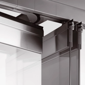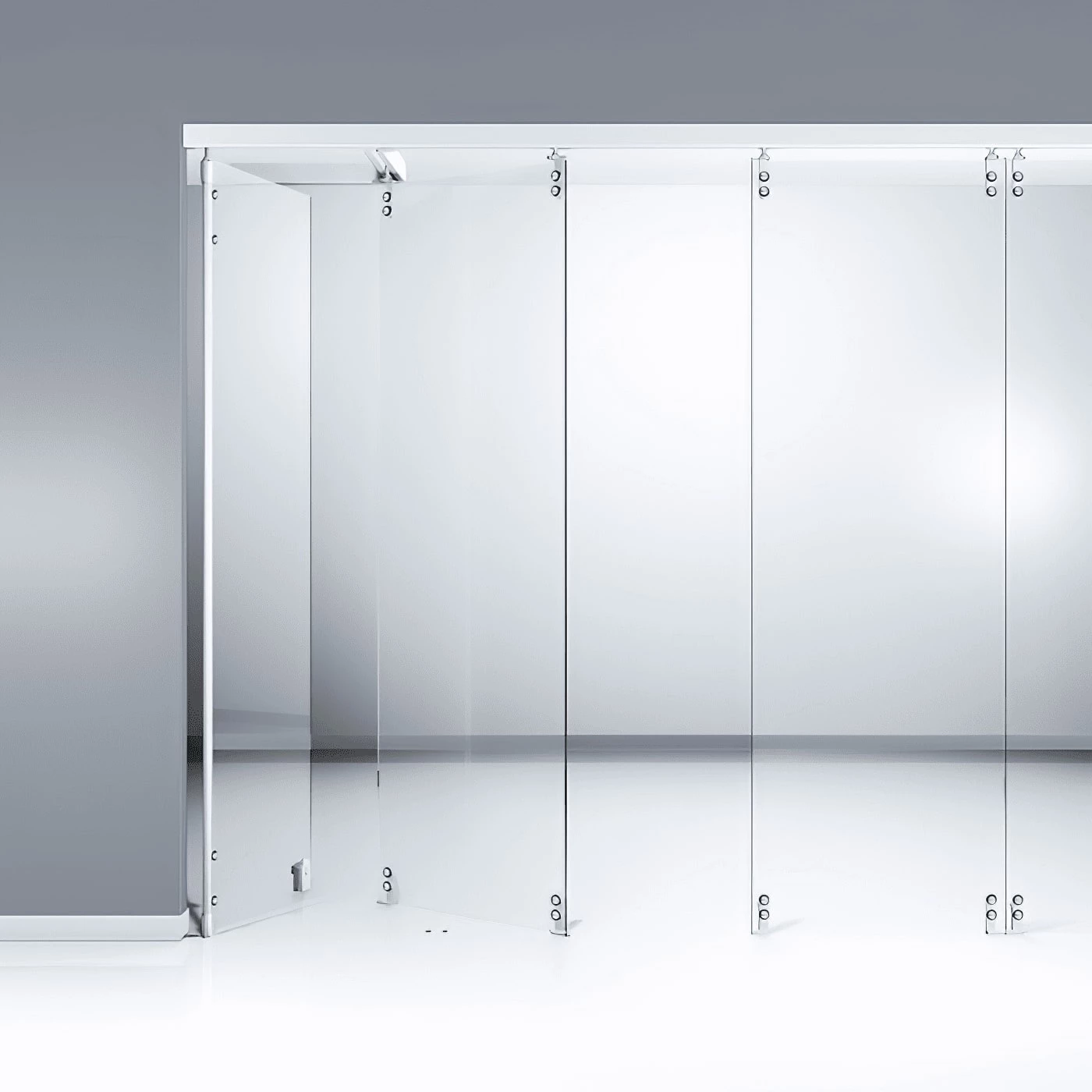 Секции из стекла складываются в рамках прямолинейной системы, где панели крепятся к потолочному треку без нижних направляющих. Доступен вариант двойной парковки. Сбор полотен осуществляется у боковины (панели на оси шириной в половину обычной). Для симметрии системы конечная секция также имеет ширину в половину обычной.