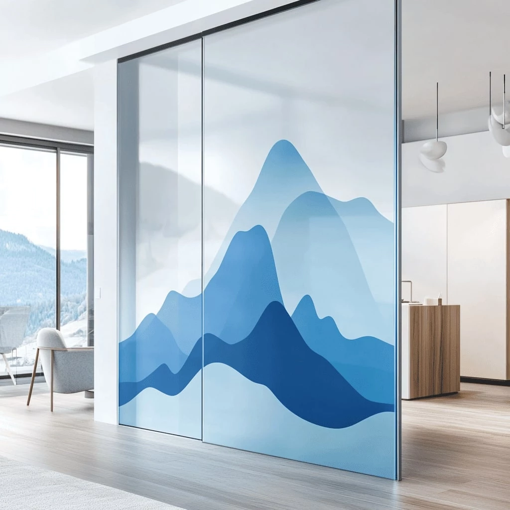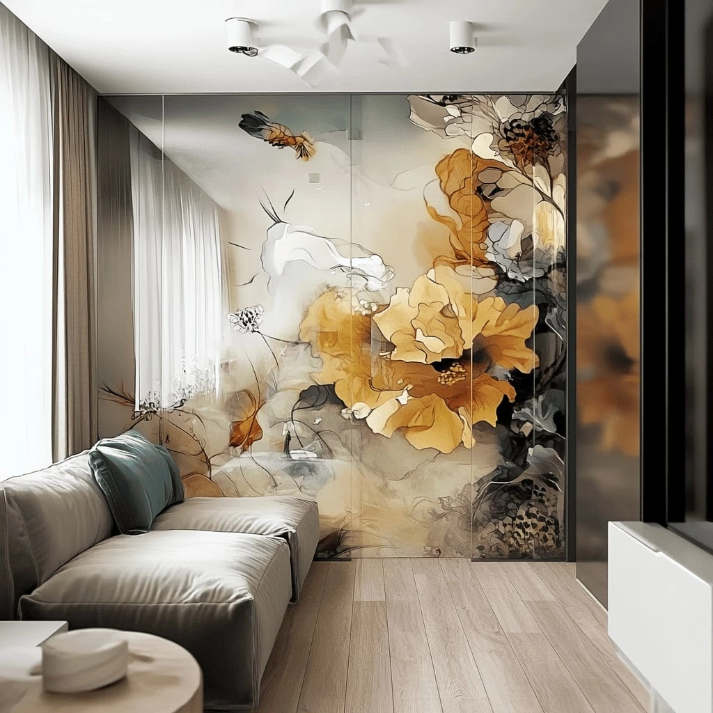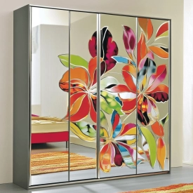 УФ-печать подходит для интерьерного оформления крупных полотен в формате цельных изображений на перегородках и межкомнатных дверях. Размер витража при данной методике изготовления ограничен только техническими характеристиками принтера (примерно 2х3 м). Возможна печать на стекле сложной криволинейной формы (хотя бы один угол не 90°). Художественными вставками можно дополнить двери шкафов-купе и гардеробов, ниши проема, элементы стеклянного пола, столешницы. Фотографическая точность воспроизводства изображений позволяет проводить любые манипуляции с рисунком: